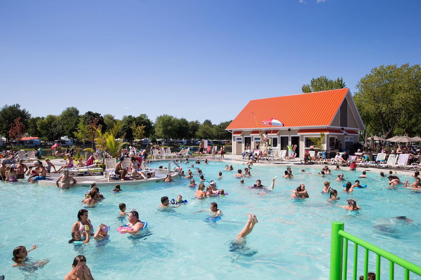 Camping Rimbo, Sainte-Victoire-de-Sorel : Beaucoup d’emplacements à l’ombre. Aussi, piscine extérieure, tennis, salle communautaire, piste cyclable, et terrains de jeux.